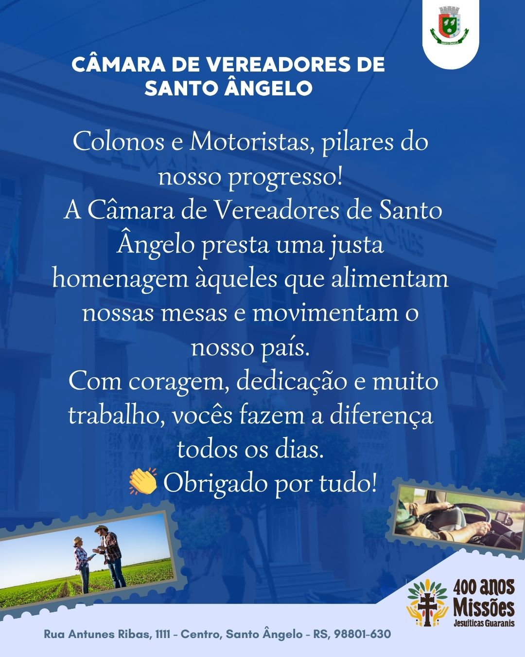A Câmara de Vereadores parabeniza todos os colonos e motoristas