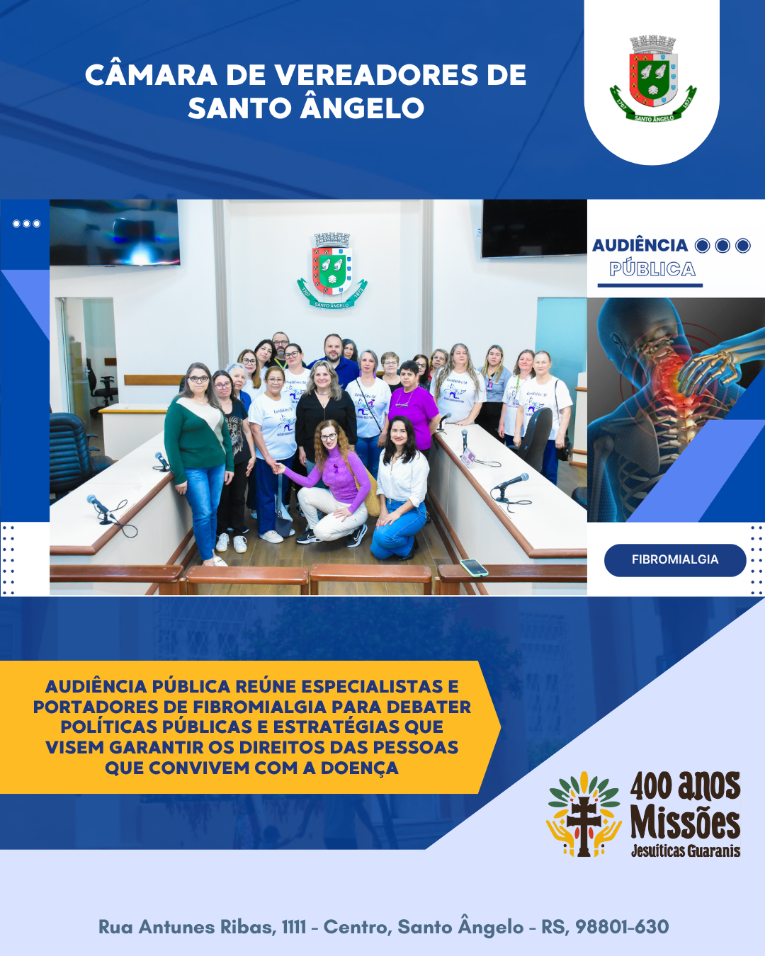 A audiência destacou a ausência de profissionais capacitados, a dificuldade de acesso a serviços como fisioterapia e acompanhamento psicológico, além da necessidade de políticas públicas mais efetivas. Também foram apresentadas legislações que amparam os portadores da doença: a Lei Municipal nº 4.296/2019, que garante prioridade de atendimento em Santo Ângelo, e a Lei Federal nº 15.176/2025, que reconhece a fibromialgia como deficiência a partir de 2026, ampliando direitos como cotas, aposentadoria especial e isenção de impostos.