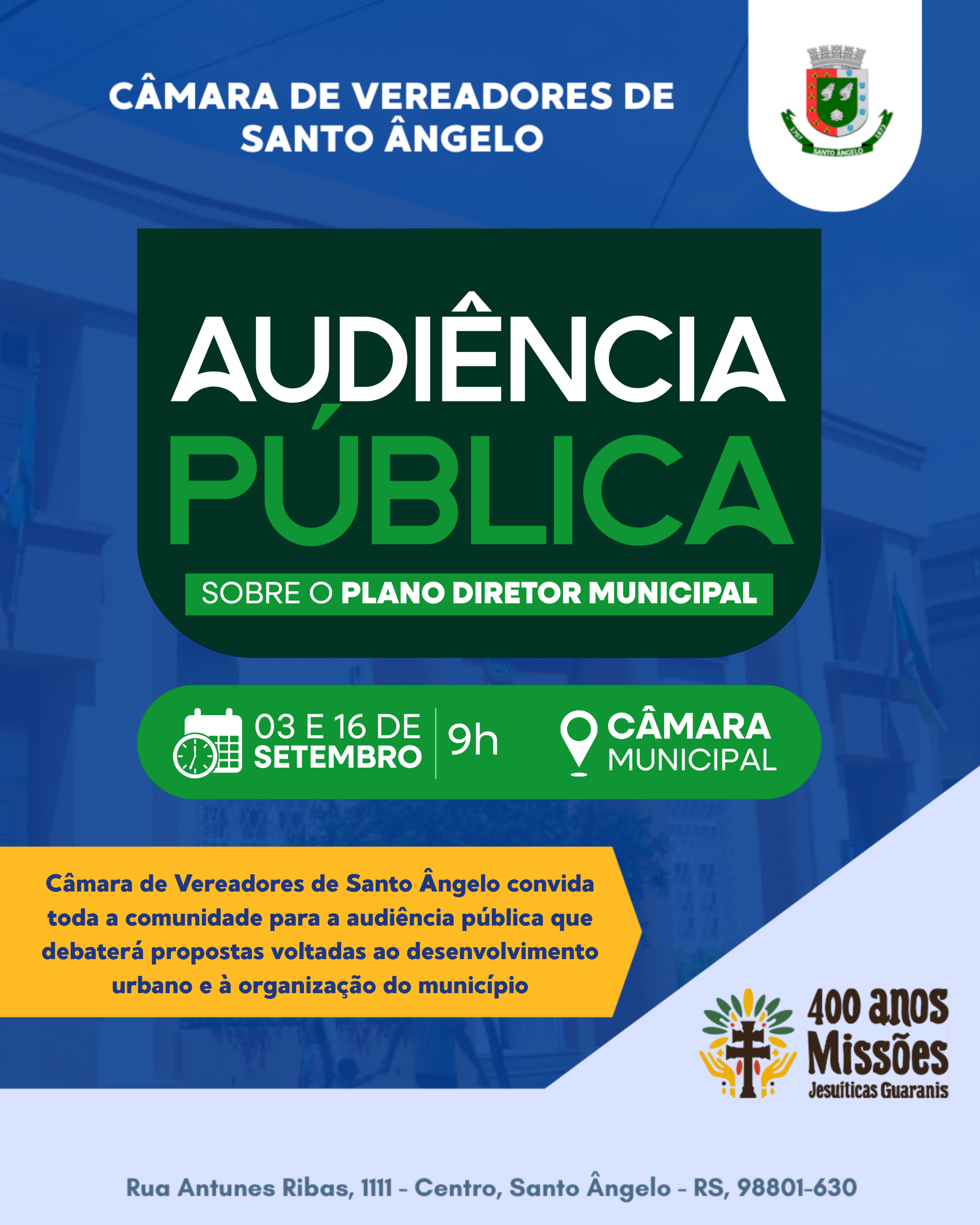 Essa audiência tem caráter consultivo e busca promover a participação popular — seja você pessoa física ou jurídica — para informar, esclarecer e reunir elementos que subsidiem a atualização do Plano Diretor de Santo Ângelo.