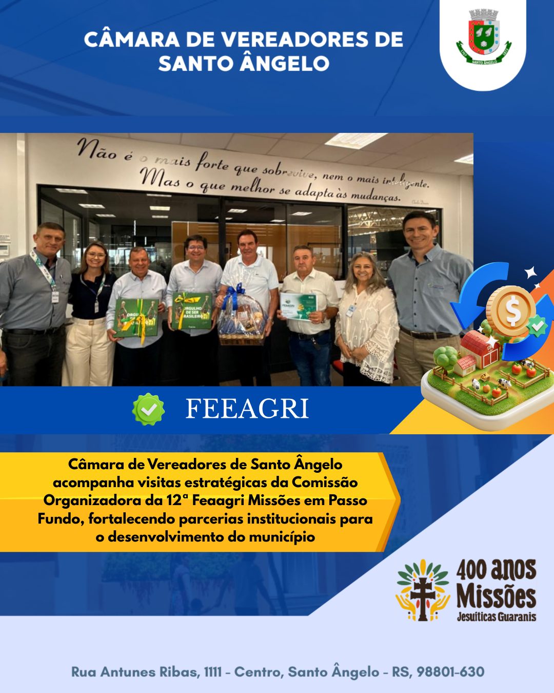 Na última segunda-feira, 16, a Comissão Organizadora da 12ª Feira da Agroindústria e Agricultura Familiar (Feaagri Missões) esteve em Passo Fundo em uma agenda de visitas estratégicas junto a importantes parceiros institucionais. O presidente da Câmara de Vereadores de Santo Ângelo, Osvaldir Ribeiro de Souza, acompanhado pelo vice-prefeito Carlos Alberto Gonçalves, pelo presidente da Feaagri Daniel Casarin e pela produtora executiva Odilla Motta, da MK Produções Culturais, acompanhou a visita, oportunidade em que foi apresentado o novo formato da Feira ao gerente de Marketing da Comercial Zaffari/Stok Center, Eron Moraes, e ao empresário Pedro Brair, presidente da Rede de Farmácias São João.