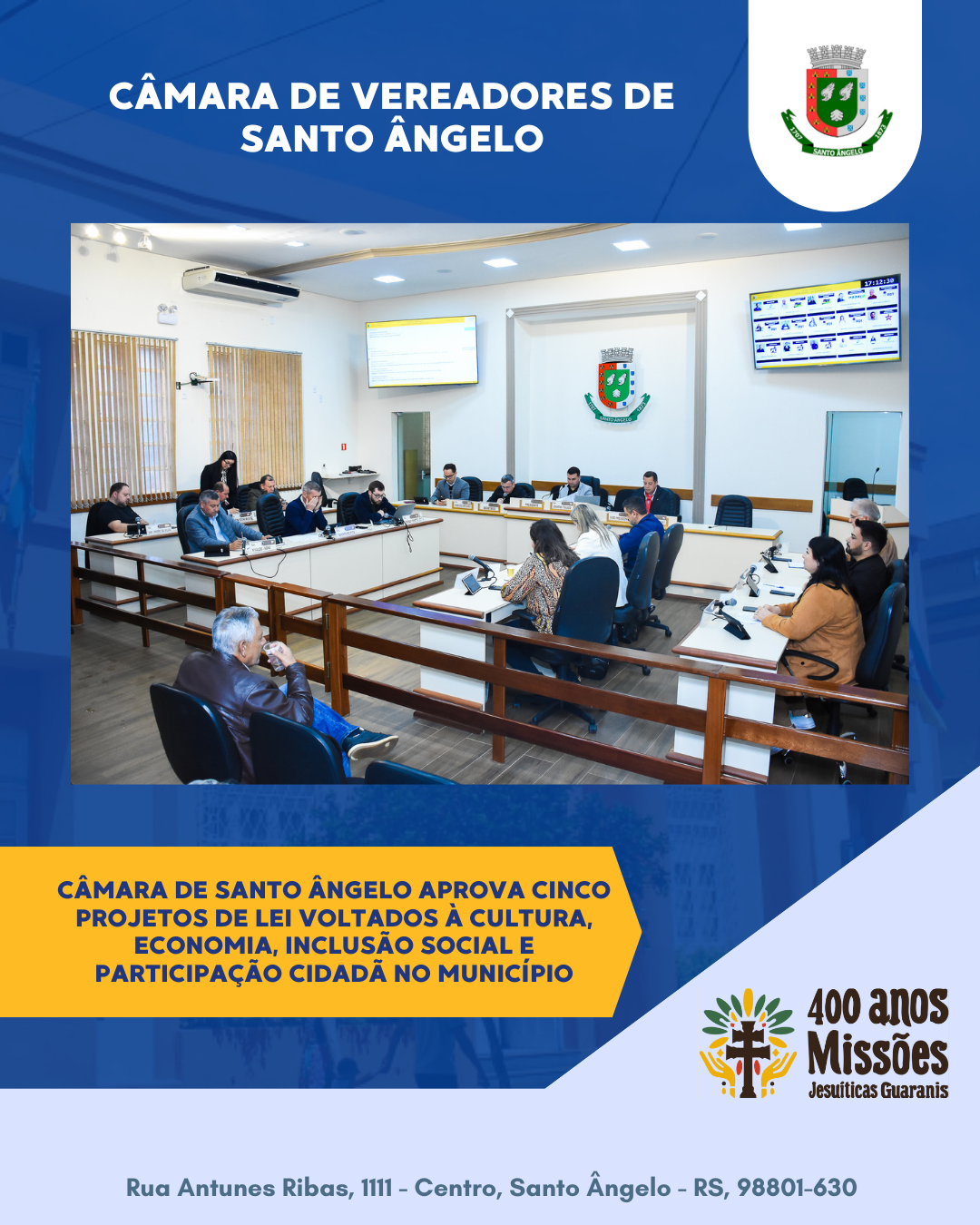 Em sessão ordinária realizada na noite da última segunda-feira, 8, a Câmara de Vereadores de Santo Ângelo aprovou cinco projetos de lei que evidenciam o compromisso do Legislativo com o desenvolvimento social, econômico e cultural do município. A pauta da noite foi marcada por debates produtivos e decisões que impactam diretamente a vida da comunidade santo-angelense.