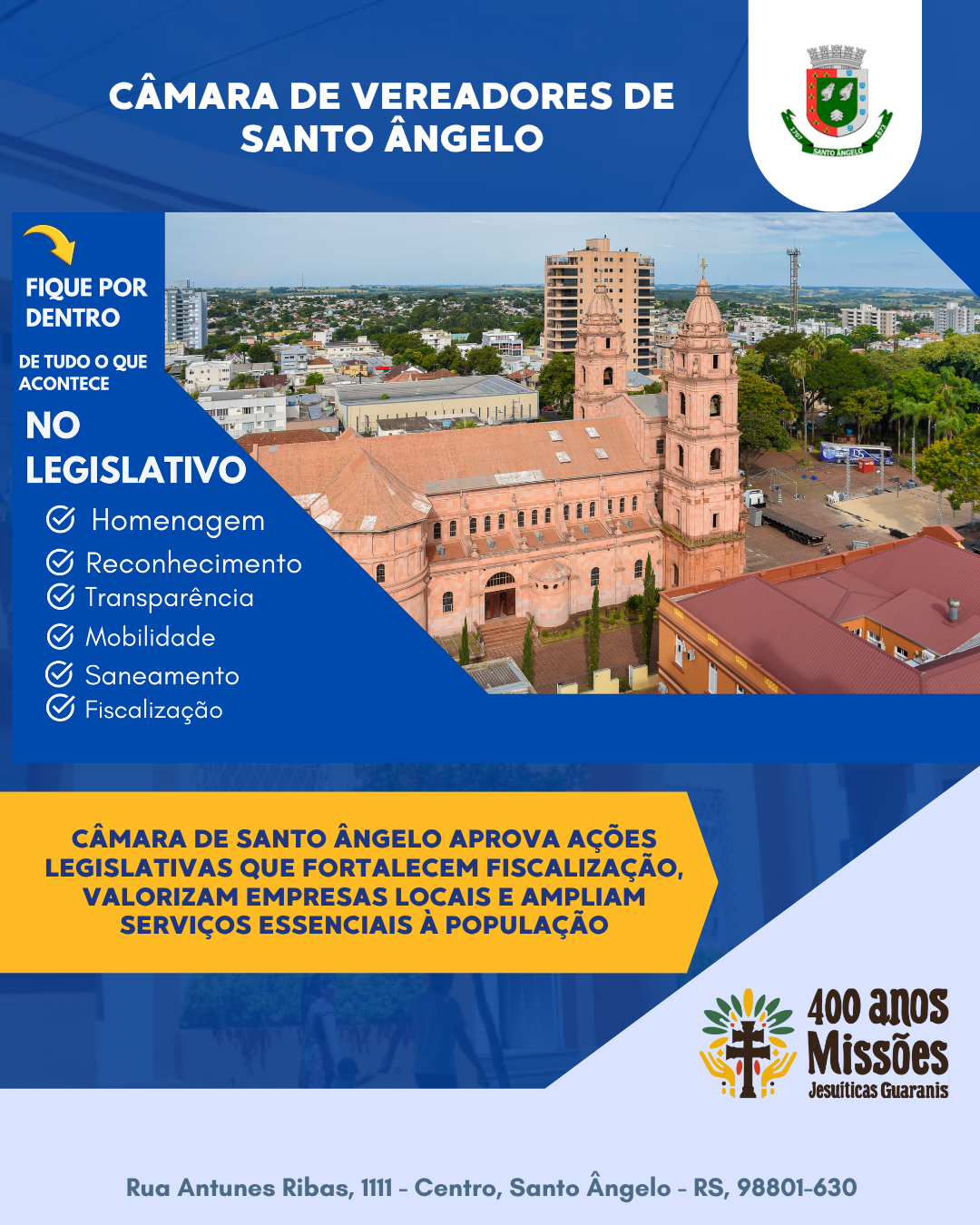 Em Sessão Ordinária realizada na última segunda-feira, 20, a Câmara de Vereadores de Santo Ângelo aprovou uma série de proposições que reforçam o compromisso do Legislativo com o desenvolvimento local, a valorização de empresas e lideranças e a fiscalização da gestão pública.