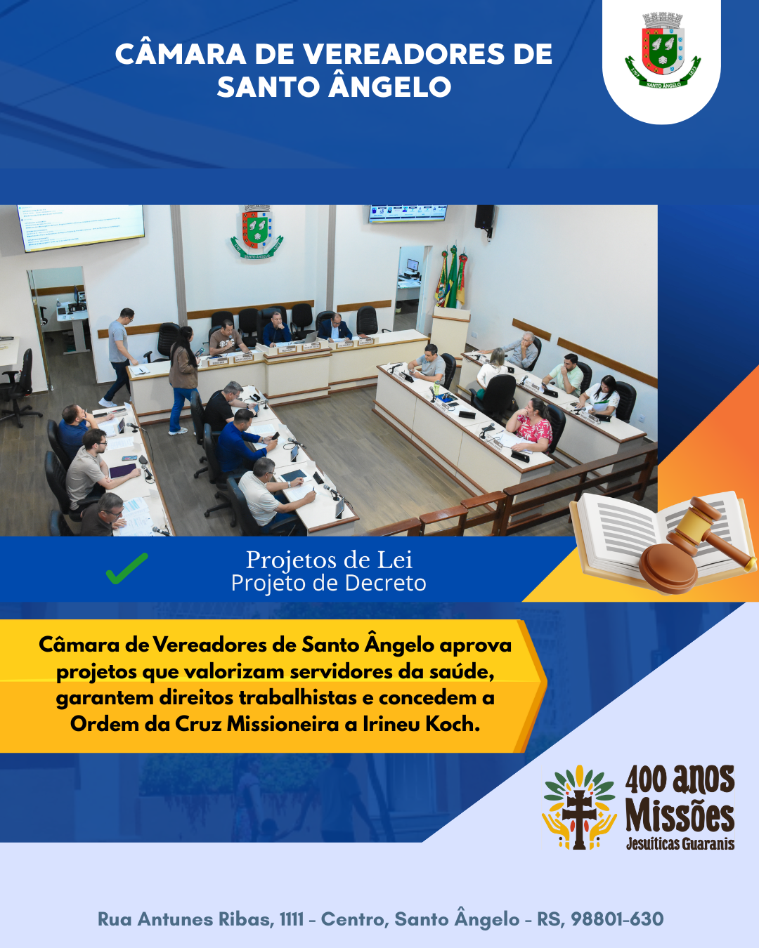 Encerrando a seara das deliberações quanto aos projetos de lei, o plenário aprovou o Decreto Legislativo que concede a Ordem da Cruz Missioneira ao senhor Irineu Koch, em reconhecimento à sua trajetória e contribuição para a comunidade. A homenagem foi proposta pelo vereador Cristian Fontella, aprovada pela Comissão Especial e pelo plenário, sendo promulgada pelo presidente da Câmara, Osvaldir Ribeiro de Souza.
