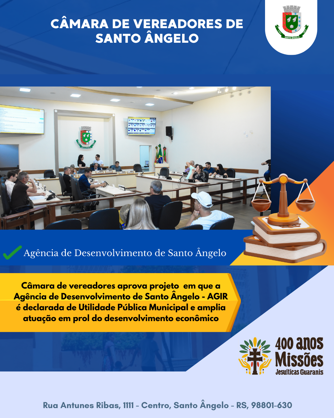 Na sessão ordinária realizada na noite da última segunda-feira, 2, a Câmara de Vereadores de Santo Ângelo aprovou o Projeto de Lei apresentado pelo vereador Jonatas Toledo, do Progressistas, que declara de Utilidade Pública Municipal a AGIR – Agência de Desenvolvimento de Santo Ângelo. A entidade, sem fins lucrativos e com sede na Avenida Brasil, atua há anos na promoção do desenvolvimento econômico, social e sustentável do município, articulando iniciativas entre o poder público, a iniciativa privada, o setor produtivo, instituições de ensino e a sociedade civil organizada.