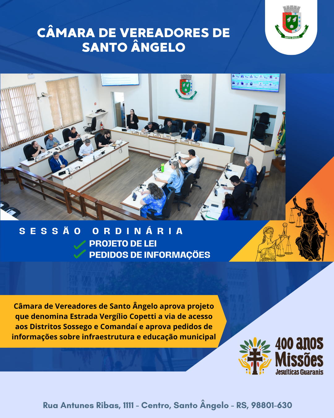 Na noite da última segunda-feira, 24, o Plenário Juarez Alves Lemos recebeu mais uma sessão da Câmara de Vereadores de Santo Ângelo, marcada por deliberações que reforçam a valorização da memória comunitária e o compromisso com a transparência na gestão pública. Foi aprovado o projeto de lei de autoria do vereador Nivaldo Langer de Moura (PP), o Nêne, que denomina Estrada Vergílio Copetti a via de acesso ao Distrito Sossego e Distrito Comandaí. A homenagem reconhece a trajetória de Vergílio Copetti, agricultor, ambientalista e líder comunitário que dedicou sua vida ao desenvolvimento de Santo Ângelo. Copetti foi vereador por 17 anos, fundador do Sindicato dos Trabalhadores Rurais e do Sicredi local, além de ter se destacado na preservação ambiental e na defesa das bacias hidrográficas. Recebeu a Comenda da Ordem Missioneira e o título de Cidadão Honorário de Santo Ângelo, deixando um legado de trabalho, solidariedade e compromisso com o bem comum, que agora se perpetua em uma estrada que simboliza sua história.