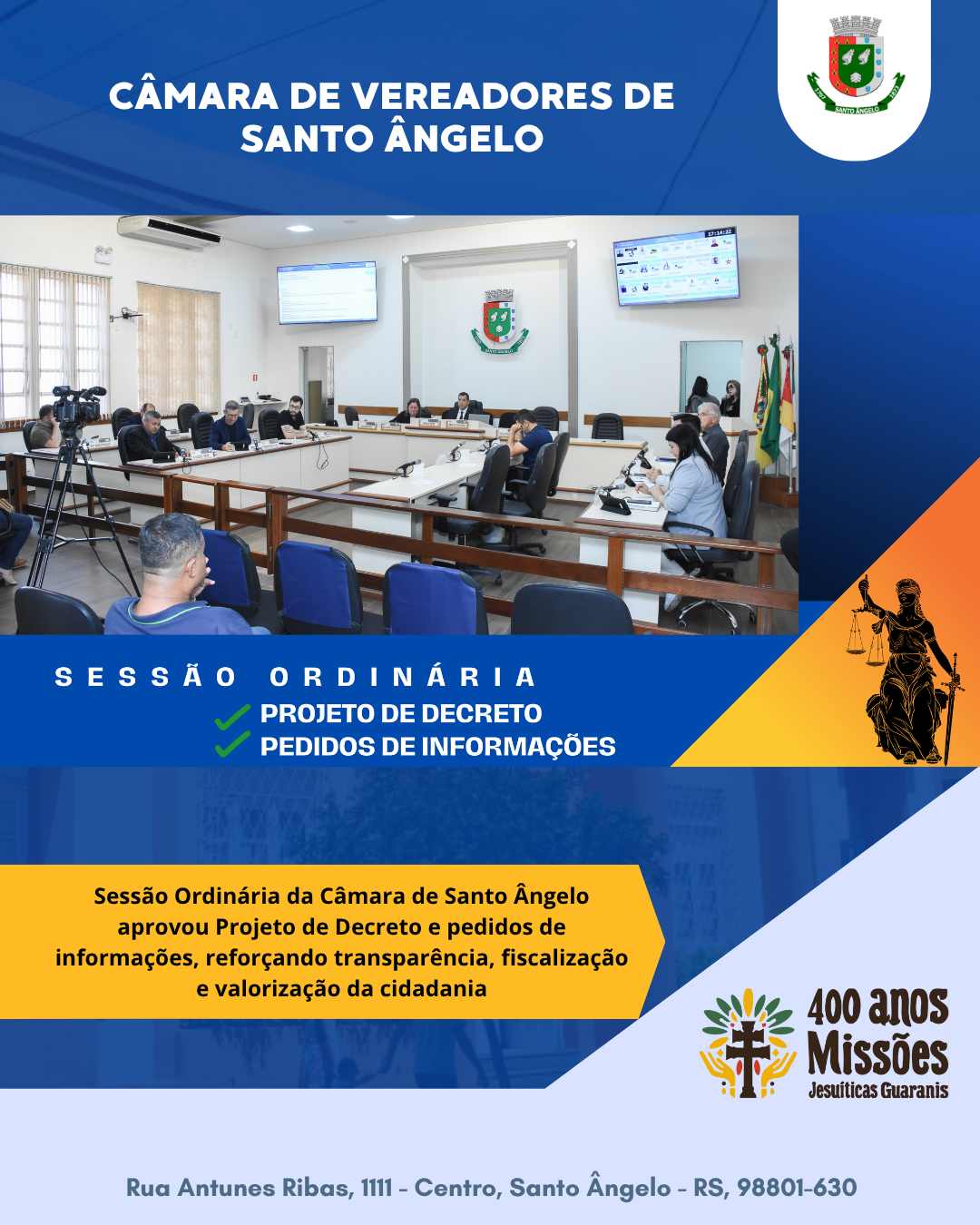 A Sessão Ordinária demonstrou o papel da Câmara de Vereadores de Santo Ângelo como espaço de diálogo, fiscalização e valorização da cidadania. Sob a presidência do vereador Carlos Gromoski, cada deliberação reafirma o compromisso desta Casa Legislativa com a boa aplicação dos recursos públicos e com o fortalecimento das políticas que impactam diretamente a vida da comunidade.
