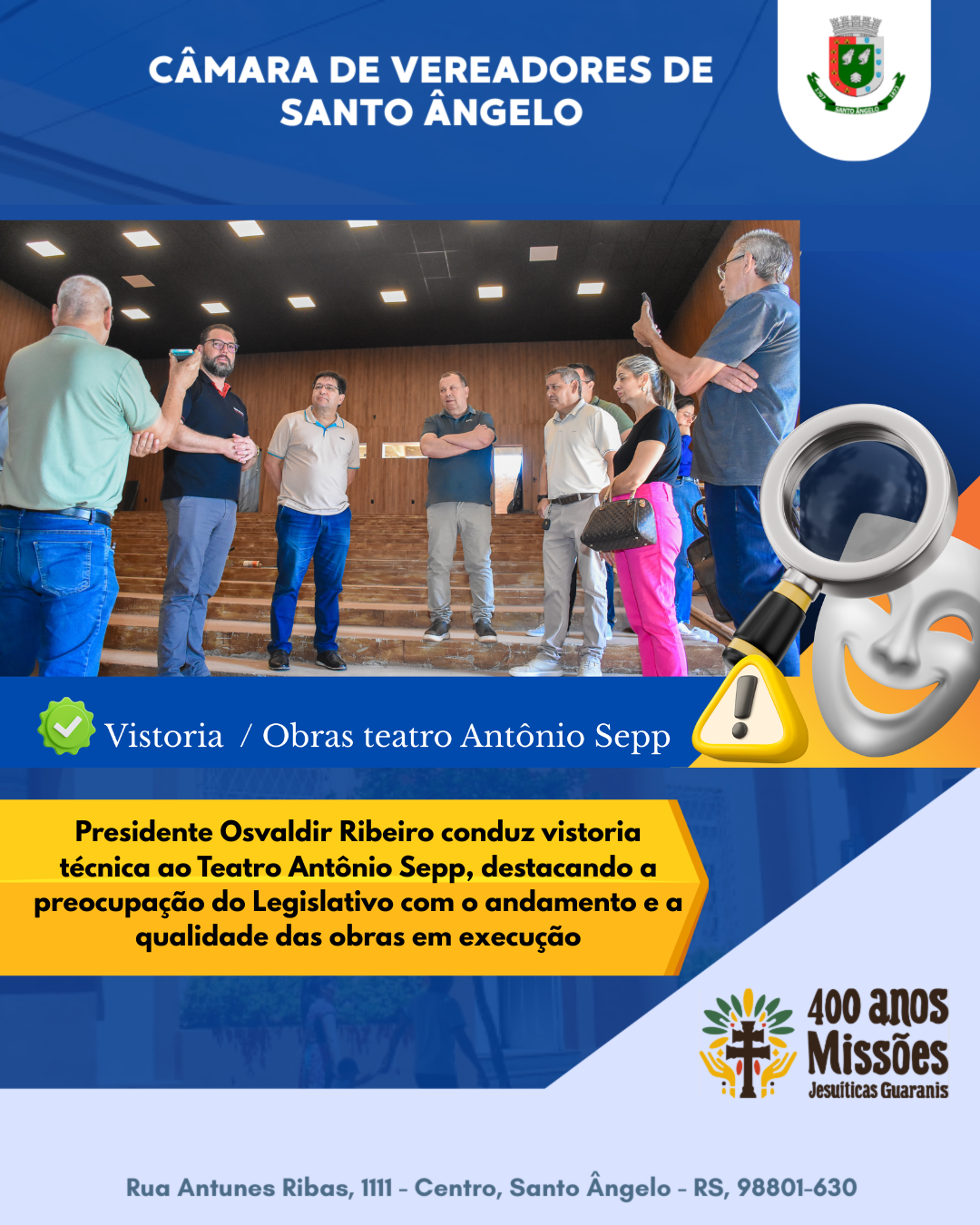 Ao conduzir a vistoria, o presidente Osvaldir Ribeiro manifestou sua extrema preocupação com a demora e o estágio atual das obras. Ele destacou que a Câmara de Vereadores está realizando fiscalizações constantes e questionamentos severos à empresa responsável, e anunciou que o Legislativo contratará uma assessoria técnica para acompanhar cada etapa da execução. Ribeiro convocou a comunidade para apoiar a Câmara e reforçou que fará o possível para que o teatro esteja pronto ainda em 2026, integrando-se às comemorações dos 400 anos das Missões.