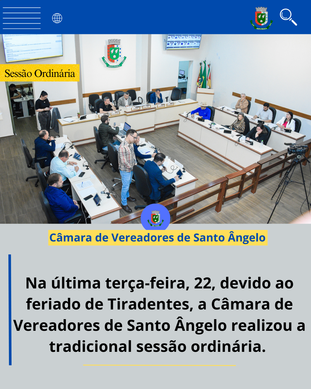 Na última terça-feira, 22, devido ao feriado de Tiradentes, aNa última terça-feira, 22, devido ao feriado de Tiradentes, a Câmara de Vereadores de Santo Ângelo realizou a tradicional sessão ordinária. O encontro trouxe debates relevantes e a aprovação de medidas que impactam diretamente o cotidiano da população.