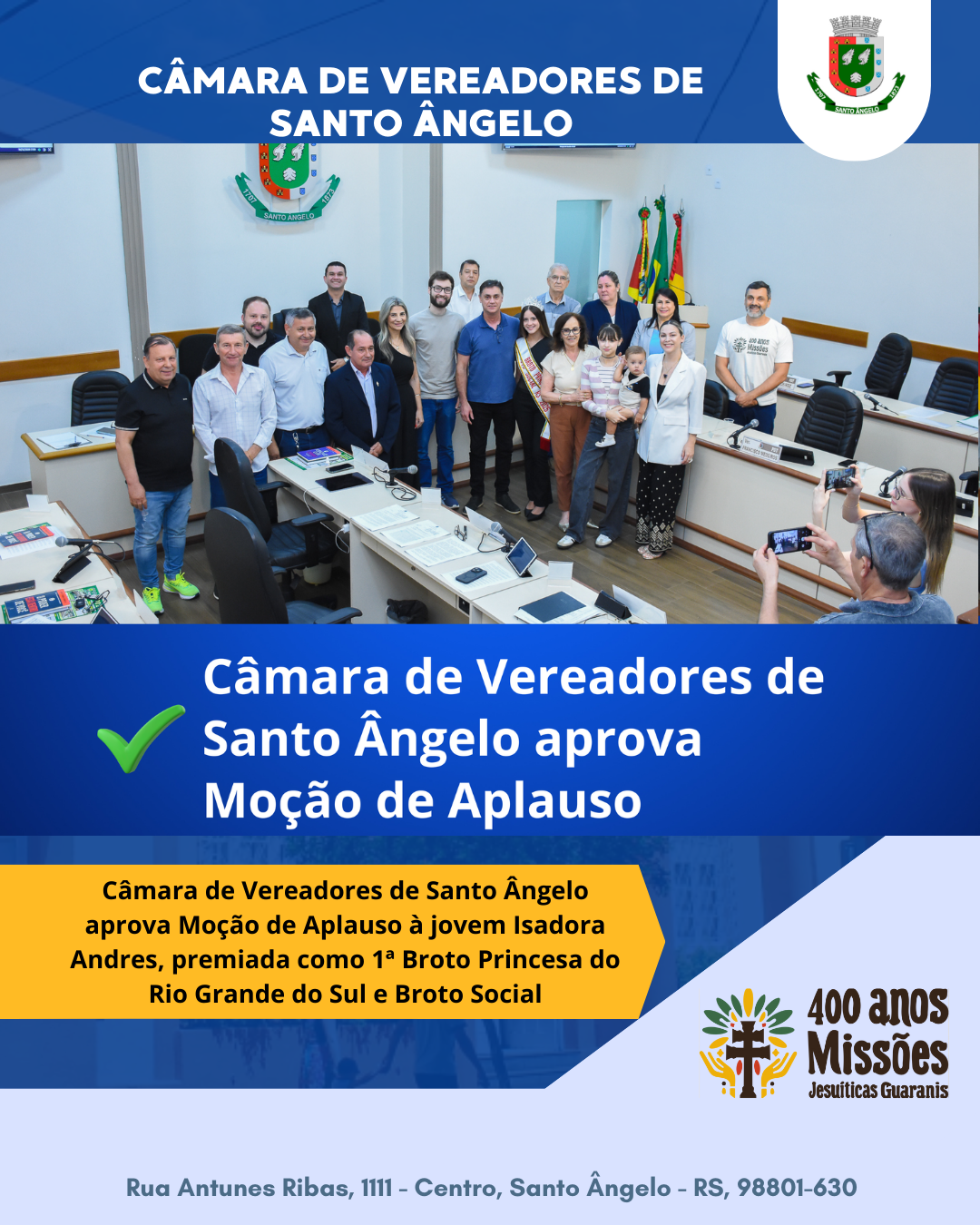 A conquista de Isadora Andres coloca o nome de Santo Ângelo em destaque mais uma vez, fortalecendo o orgulho missioneiro e demonstrando o potencial transformador da juventude da cidade. A Câmara de Vereadores, em nome de toda a comunidade santo-angelense, registra com esta Moção de Aplauso o reconhecimento pelo brilhante desempenho de Isadora no Concurso Broto Rio Grande do Sul e pela relevante contribuição social que realiza por meio de seus projetos comunitários.