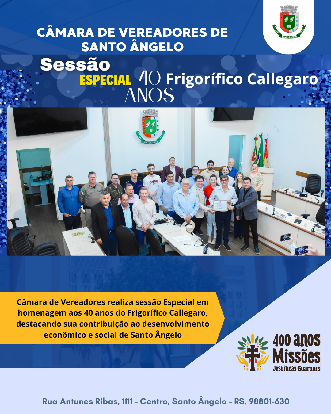 Na noite da última segunda-feira, 10, o plenário da Câmara de Vereadores de Santo Ângelo foi palco de uma sessão especial marcada por reconhecimento. A homenagem foi dedicada ao Frigorífico Callegaro, empresa que, há quatro décadas, contribui para o desenvolvimento econômico e social do município, gerando emprego, renda e colocando Santo Ângelo em destaque no cenário nacional da indústria de carnes.