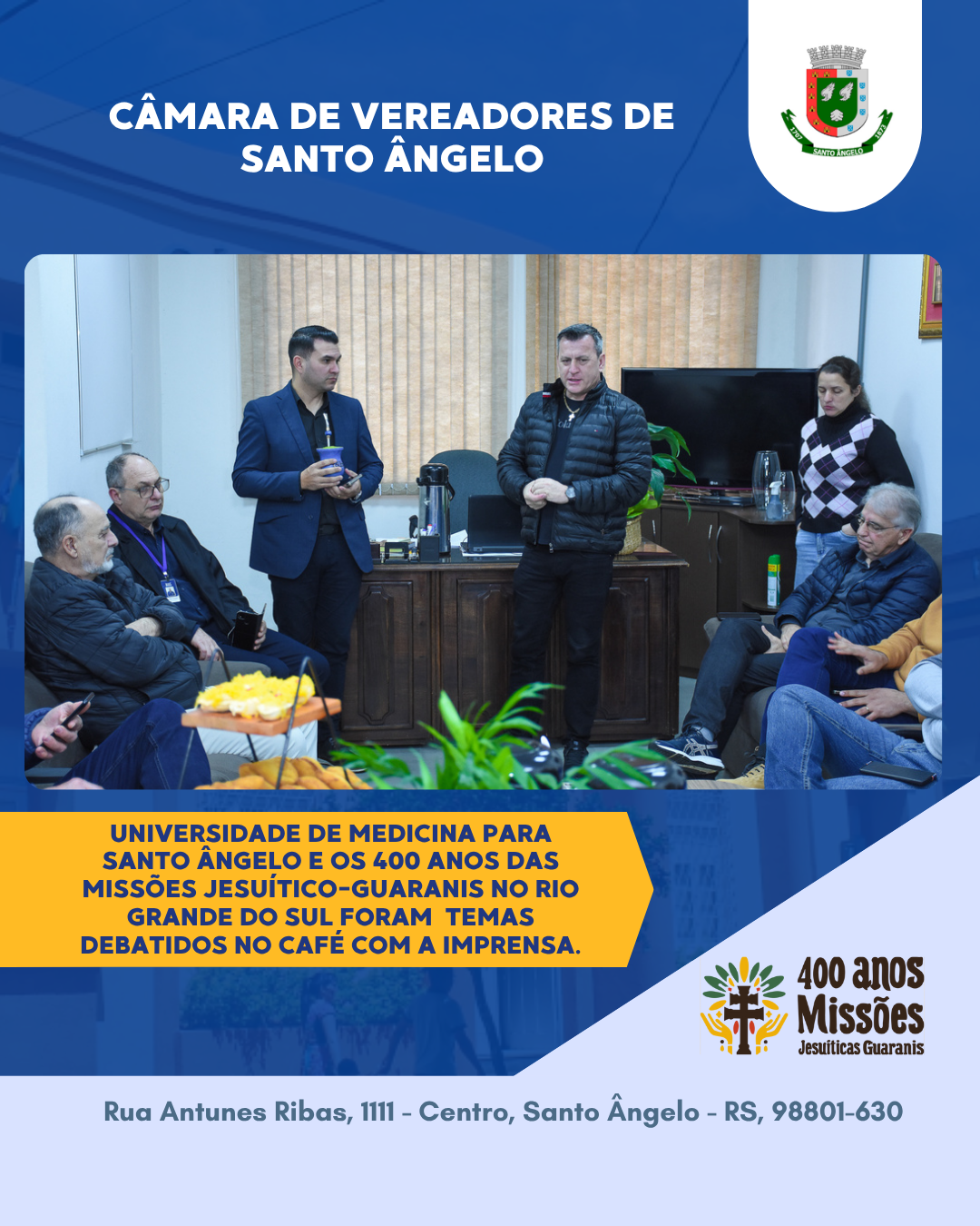 Entre os temas abordados durante o café, destacaram-se as comemorações pelos 400 anos das Missões Jesuítico-Guaranis e os esforços conjuntos para a implementação do curso de Medicina no município de Santo Ângelo. Essa pauta, tratada com atenção especial, é vista como um investimento no futuro de nossos filhos e netos, além de um marco que poderá transformar profundamente a realidade educacional e social da região.