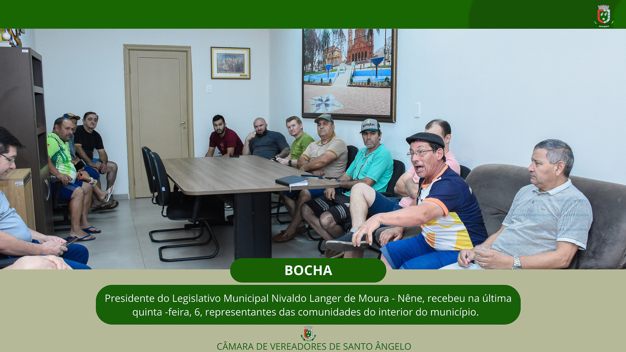 Na última quinta-feira, 6, o presidente da Câmara de Vereadores de Santo Ângelo, Nivaldo Langer de Moura - Nêne, juntamente com o Vice-Prefeito, Carlos Gonçalves o secretário de cultura e esporte, Edmilson Pretto e o coordenador de esporte, Marlon Moreira, se reuniram com várias comunidades do interior, entre elas, Comandaí, Santa Bárbara, Micuim, Barra do São João e comunidade São Pedro.