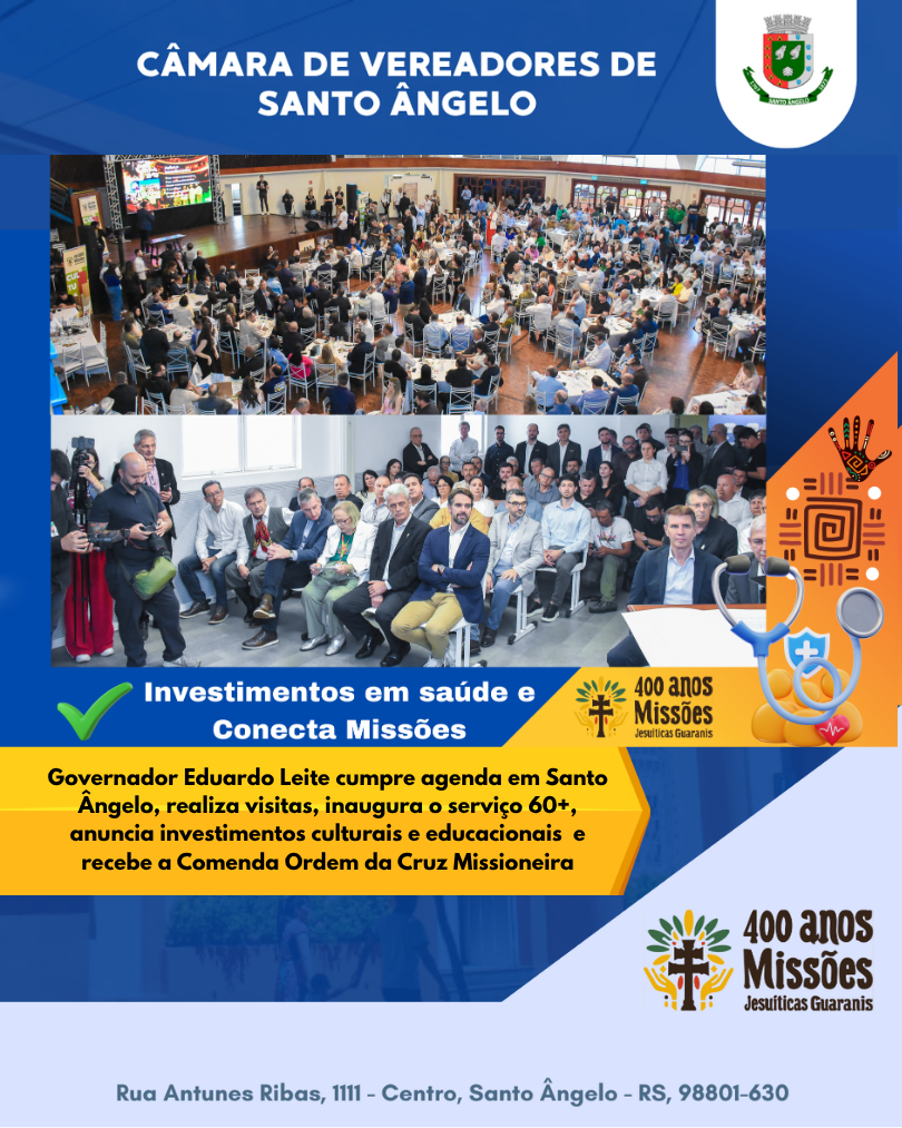 Segundo o presidente do Legislativo, Osvaldir Ribeiro, a presença do chefe do Executivo estadual na Capital das Missões é motivo de reconhecimento e gratidão. Ele ressaltou que os investimentos realizados na área da saúde, como a inauguração do serviço Saúde 60+ RS e a entrega do aparelho de ressonância magnética ao Hospital Regional das Missões, representam avanços concretos para a comunidade. Vando também agradeceu ao secretário Eduardo Loureiro pela dedicação à região e afirmou que os recursos destinados à cultura e ao turismo são fundamentais para colocar Santo Ângelo no mapa nacional e internacional, gerando progresso e desenvolvimento para toda a região missioneira.