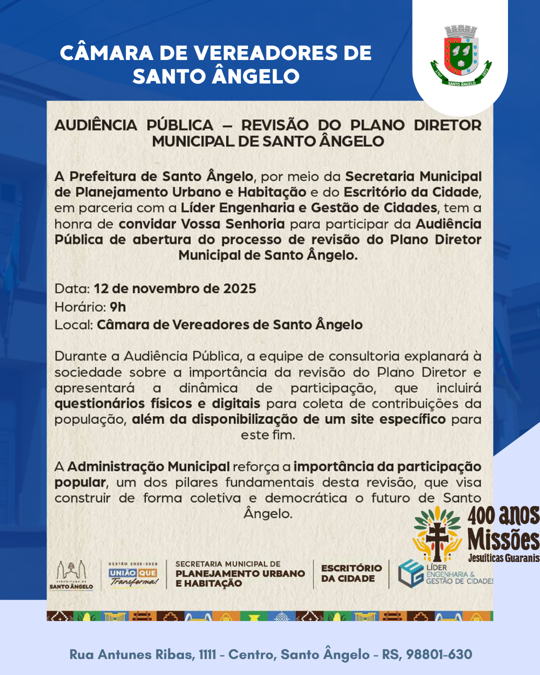 Executivo convida para Audiência Pública sobre Plano Diretor