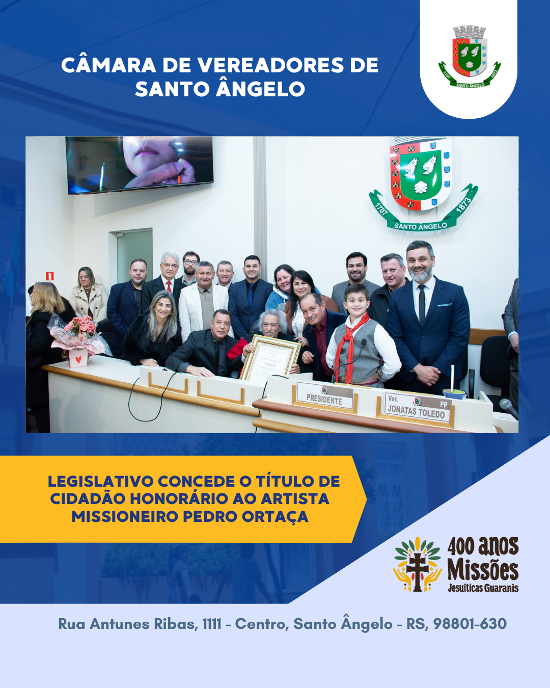 Compuseram a mesa de honra o presidente do Legislativo, Jonatas Toledo, o secretário da Mesa Diretora, Márcio Antunes, o agora cidadão santo-angelense, Pedro Ortaça, sua esposa, Rose Ortaça, o chefe de gabinete do Executivo Municipal, Carlos Kelm, a juíza federal substituta, representando a Justiça Federal, Dra. Milena Souza, o ex-vereador de Santo Ângelo na legislatura 2013–2016 e proponente do título de cidadania ao senhor Pedro Ortaça, André Marques, o diretor da Secretaria de Cultura do Estado do Rio Grande do Sul, Jacques Barbosa, o comandante do 1º Batalhão de Comunicações, coronel Plácido Garcia dos Santos, o capitão Leonardo Dambroz, Sub-comandante do 11º Batalhão de Bombeiro Militar, e a embaixadora das comemorações dos 400 anos das Missões Jesuíticas Guaranis, Marianita Ortaça.
