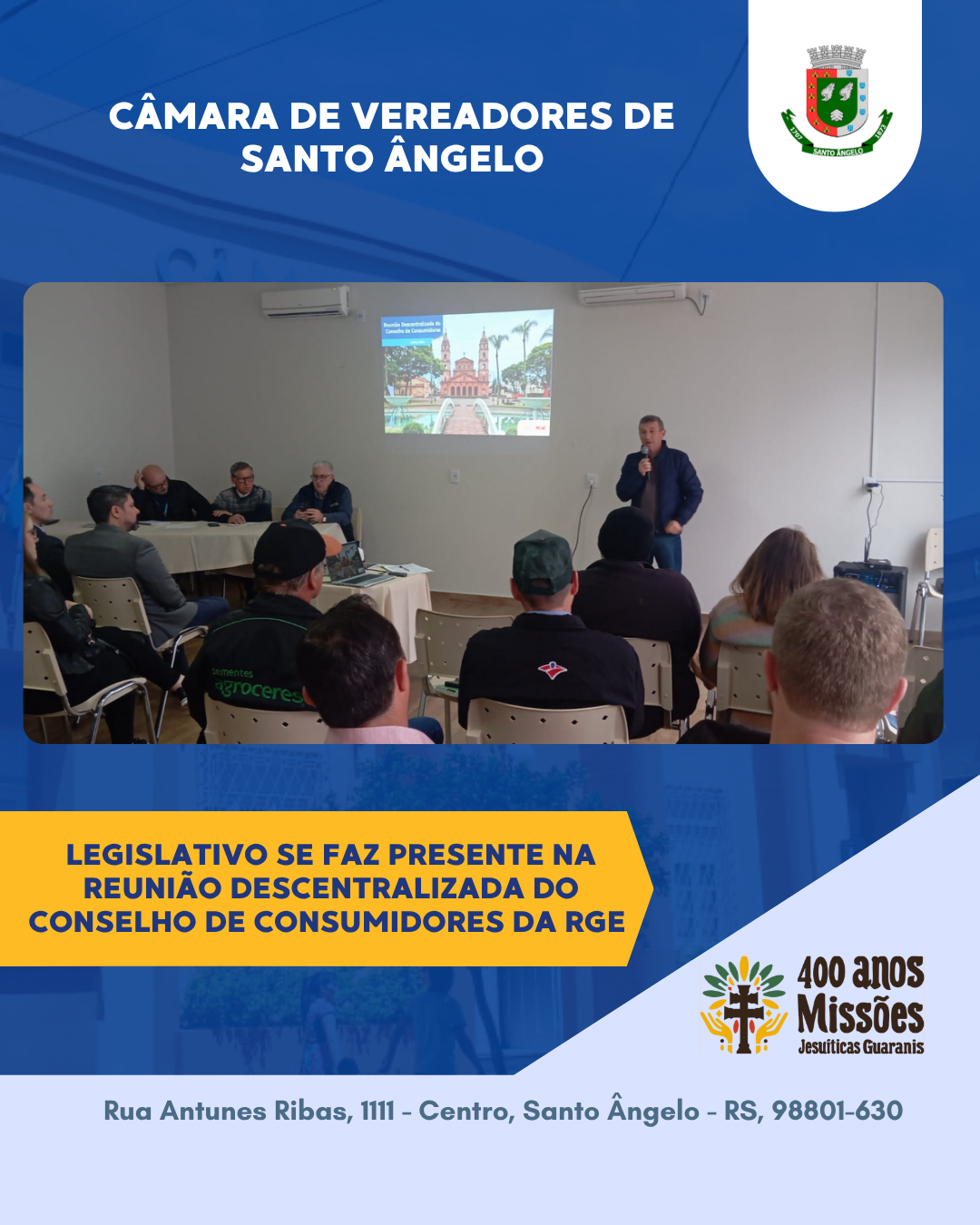 Na manhã da última terça-feira, 22, o Poder Legislativo de Santo Ângelo esteve representado na reunião descentralizada do Conselho de Consumidores da RGE, realizada nas dependências do Sindicato Rural de Santo Ângelo. O vereador Tenente Belmiro (PL) representou oficialmente a Câmara de Vereadores, participando ativamente dos debates sobre os desafios e demandas relacionados ao abastecimento de energia elétrica em toda a região.