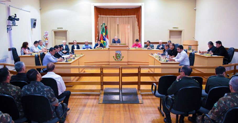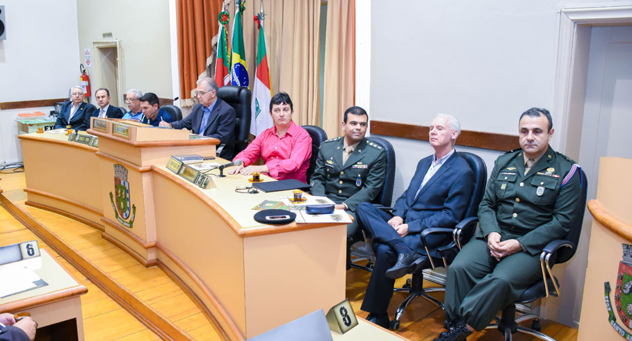 Juntamente com o Presidente da Casa Legislativa, Adolar Queiroz, vice-presidente, Vando Nolasco e Secretário da Mesa Diretora, Vinícius Makvitz, estiveram compondo a mesa de honra o senhor João Baptista, Secretário de Indústria e Comércio, que no ato esteve representando o Poder Executivo de Santo Ângelo, assim como o Comandante do 1º BCom, Coronel André Luiz dos Santos Franco. Também foram convidados a compor a mesa das autoridades o Subcomandante Sidnei Andrade, Adjunto de Comando do 1º BCom, o senhor Valdir Andres, Prefeito de Santo Ângelo quando o BCom chegou na Capital das Missões e o senhor Odorico Bessa, Presidente da Câmara de Vereadores de Santo Ângelo na chegada do Batalhão à região missioneira e atual Provedor do Hospital Santo Ângelo.