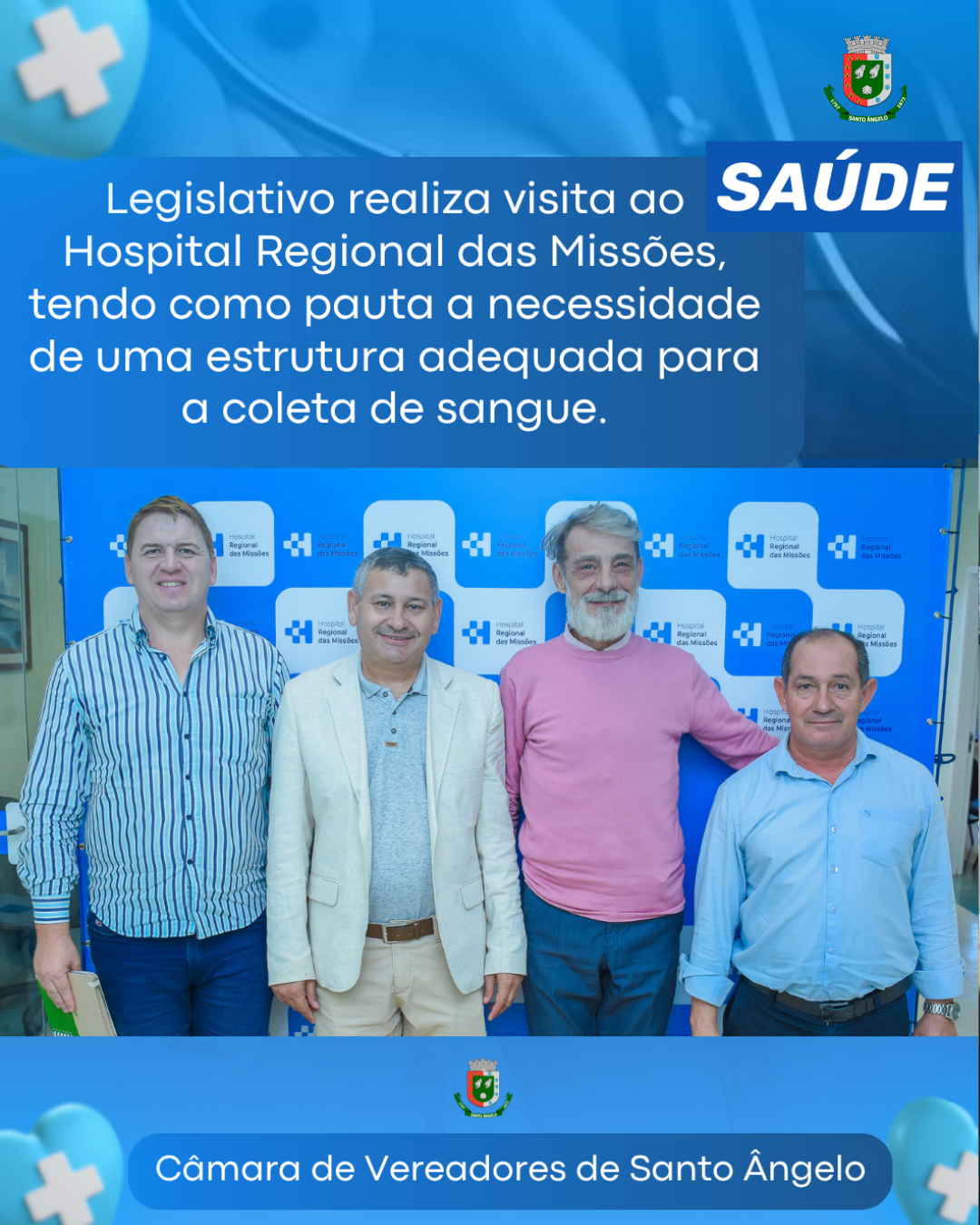 Na tarde da última quinta-feira, 5, o presidente do Legislativo de Santo Ângelo, Nivaldo Langer de Moura – Nêne, esteve no Hospital Regional das Missões, acompanhado pelo vereador Vilson Rocha – Buiú e pelo assessor parlamentar Luciano Lutzer. O encontro teve como propósito avaliar a situação da instituição, com atenção especial à necessidade de uma estrutura adequada para a coleta de sangue.