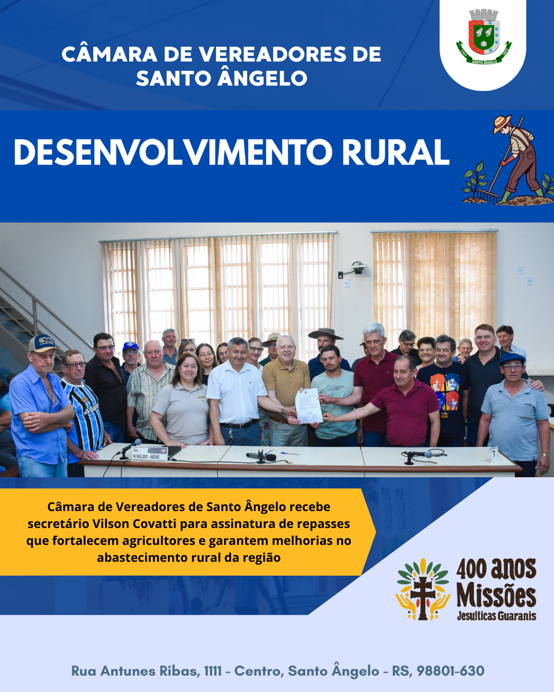 Na manhã desta sexta-feira, 28, o plenário da Câmara de Vereadores de Santo Ângelo recebeu o secretário de Desenvolvimento Rural do Rio Grande do Sul, Vilson Covatti, para a assinatura de repasses destinados a seis municípios da região. Os recursos beneficiarão agricultores e pequenos produtores rurais nas áreas de abastecimento, infraestrutura e irrigação. As cidades contempladas foram Campina das Missões, Cerro Largo, Santiago, São Martinho, São Martinho da Serra e Santo Ângelo.