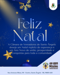 23 de dezembro de 2025 O Poder Legislativo de Santo Ângelo deseja um Feliz Natal e próspero ano novo à comunidade santo-angelense
