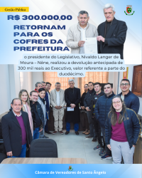 Legislativo antecipa 300 mil reais ao Executivo valor referente a parte do duodécimo -