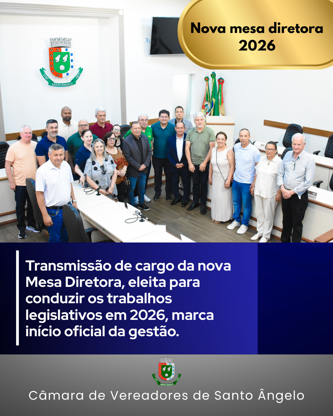 A nova Mesa Diretora assume os trabalhos a partir de 1º de janeiro de 2026, conforme determina o regimento interno, e terá a missão de conduzir os rumos da Câmara em um ano que promete grandes desafios e oportunidades.
