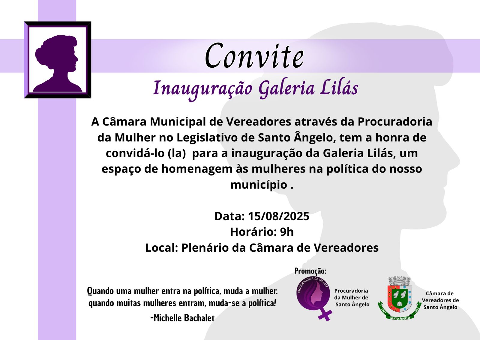 "O Legislativo Municipal convida toda a comunidade para a inauguração da Galeria Lilás na próxima sexta-feira dia 15