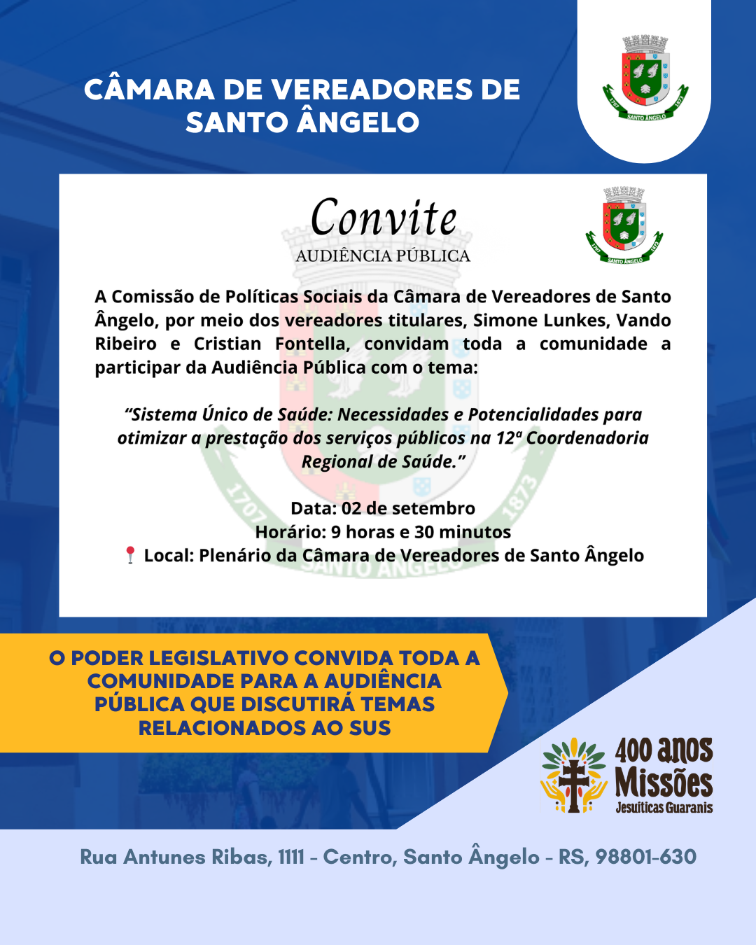 A Comissão de Políticas Sociais da Câmara de Vereadores de Santo Ângelo, por meio dos vereadores titulares, Simone Lunkes, Vando Ribeiro e Cristian Fontella, convidam toda a comunidade a participar da Audiência Pública com o tema: