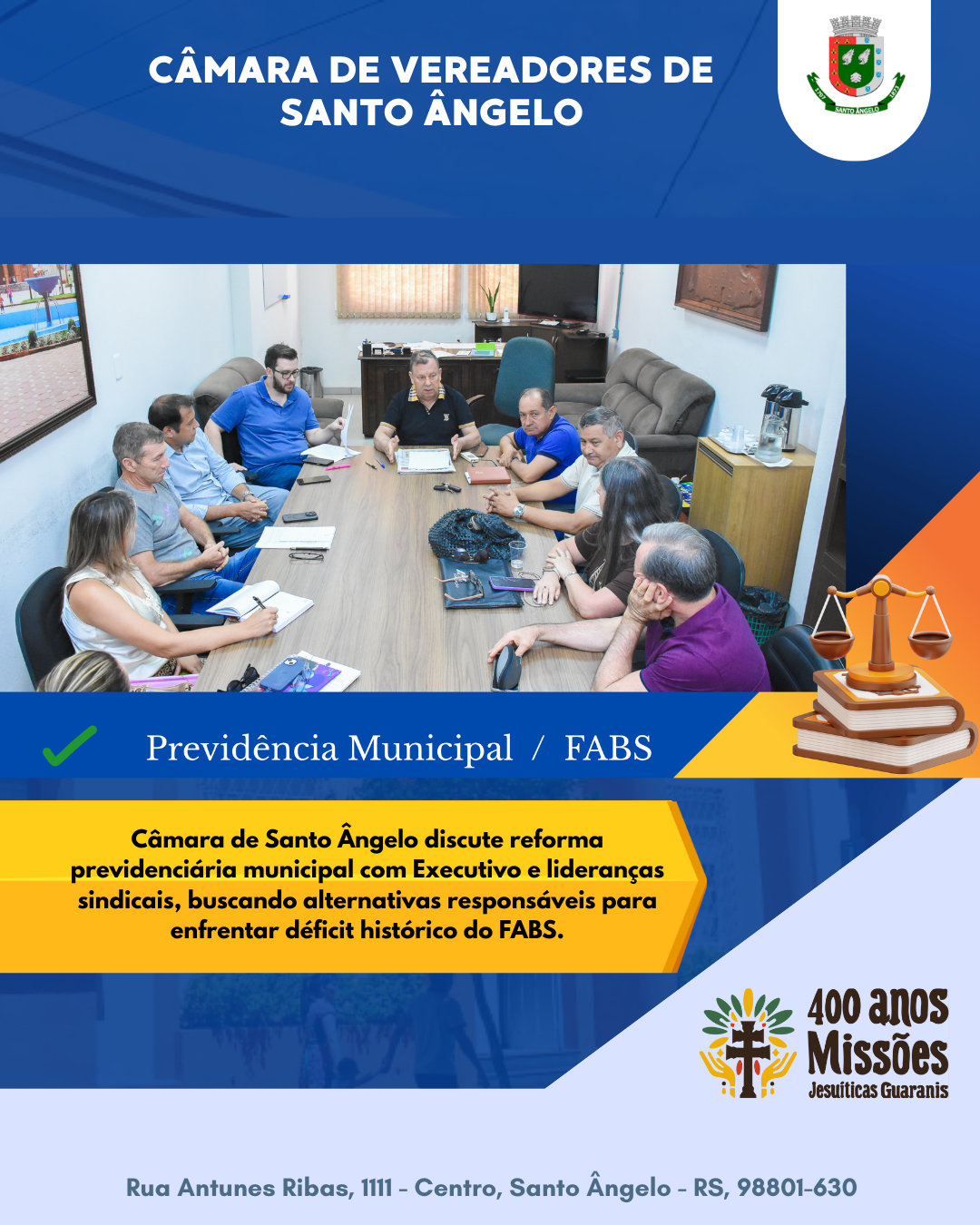 Na tarde da última sexta-feira, 6, a Câmara de Vereadores de Santo Ângelo abriu espaço para um importante diálogo sobre a reforma previdenciária municipal. A reunião, realizada no gabinete da presidência, reuniu representantes do Executivo, lideranças sindicais e vereadores, com o objetivo de alinhar pontos fundamentais do projeto de lei que será apreciado em plenário na sessão ordinária desta segunda-feira, 9.