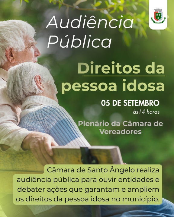 A Câmara de Vereadores de Santo Ângelo tem a honra de convidar você para um momento de escuta, reflexão e construção coletiva: a Audiência Pública sobre os Direitos da Pessoa Idosa, que acontece nesta sexta-feira, 5 de setembro, às 14h, no Plenário do Legislativo.