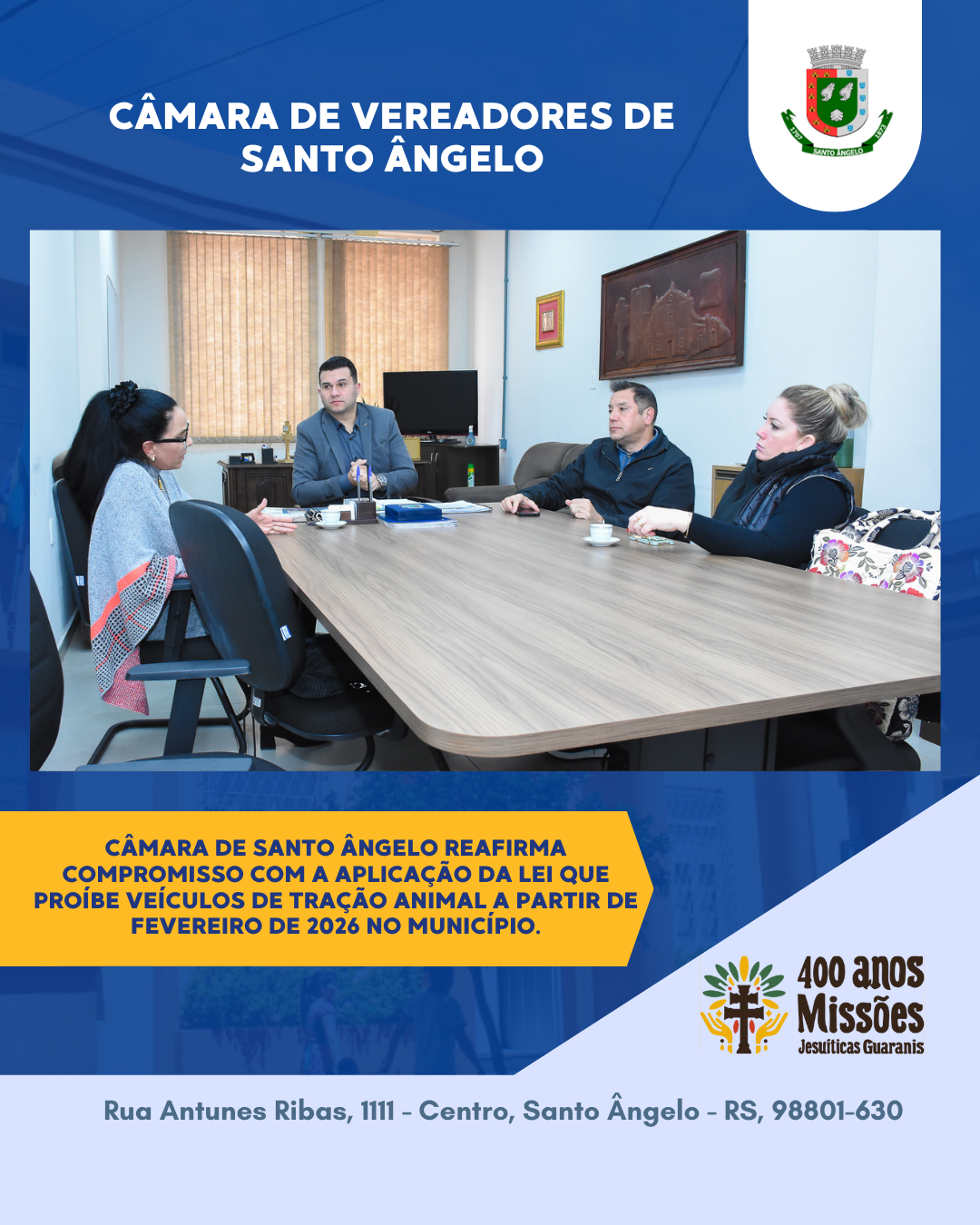 Na tarde desta segunda-feira, 25, o presidente da Câmara de Vereadores de Santo Ângelo, Jonatas Toledo, acompanhado do vice-presidente da Mesa Diretora, Carlos Gromoski, recebeu representantes da ONG Pé de Pano no gabinete da presidência. O encontro tratou da proximidade da entrada em vigor da Lei Municipal nº 4.393/2021, que proíbe a circulação de veículos de tração animal a partir de 12 de fevereiro de 2026.